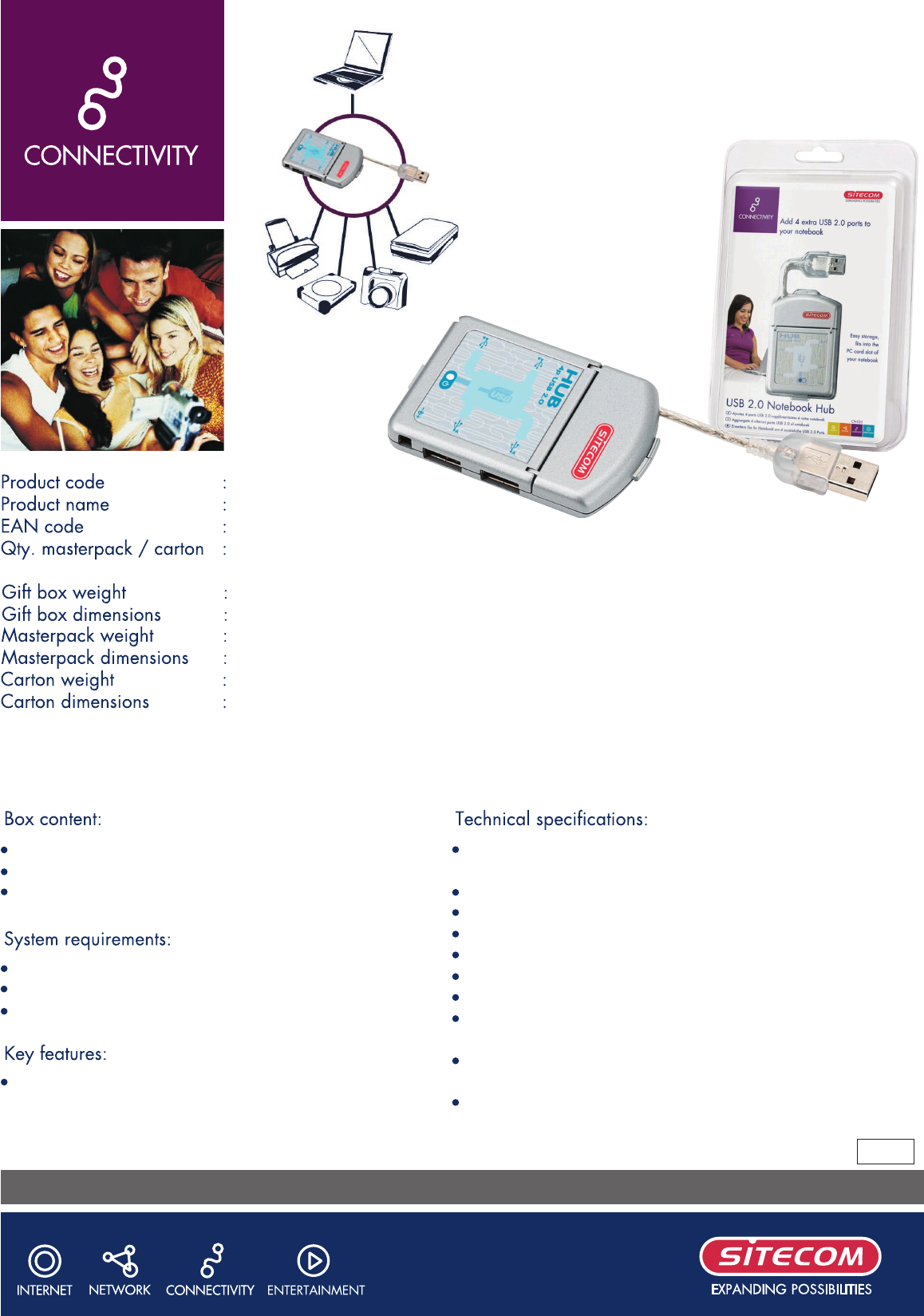 The USB 2.0 Notebook Hub enables you to connect multiple USB peripheral devices via the computer’s USB port.