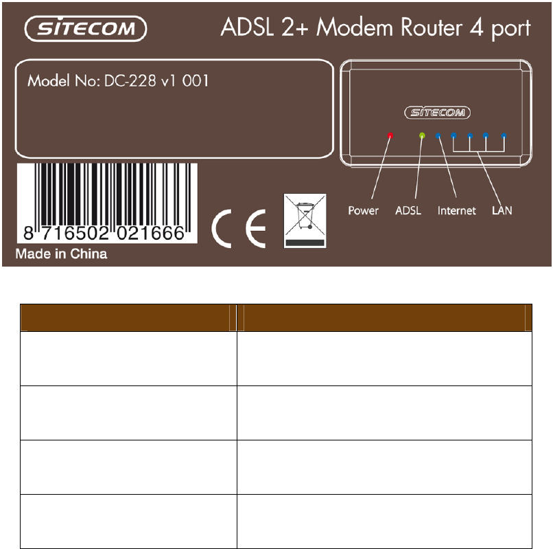 The front panel describes the corresponding LED indications and port
