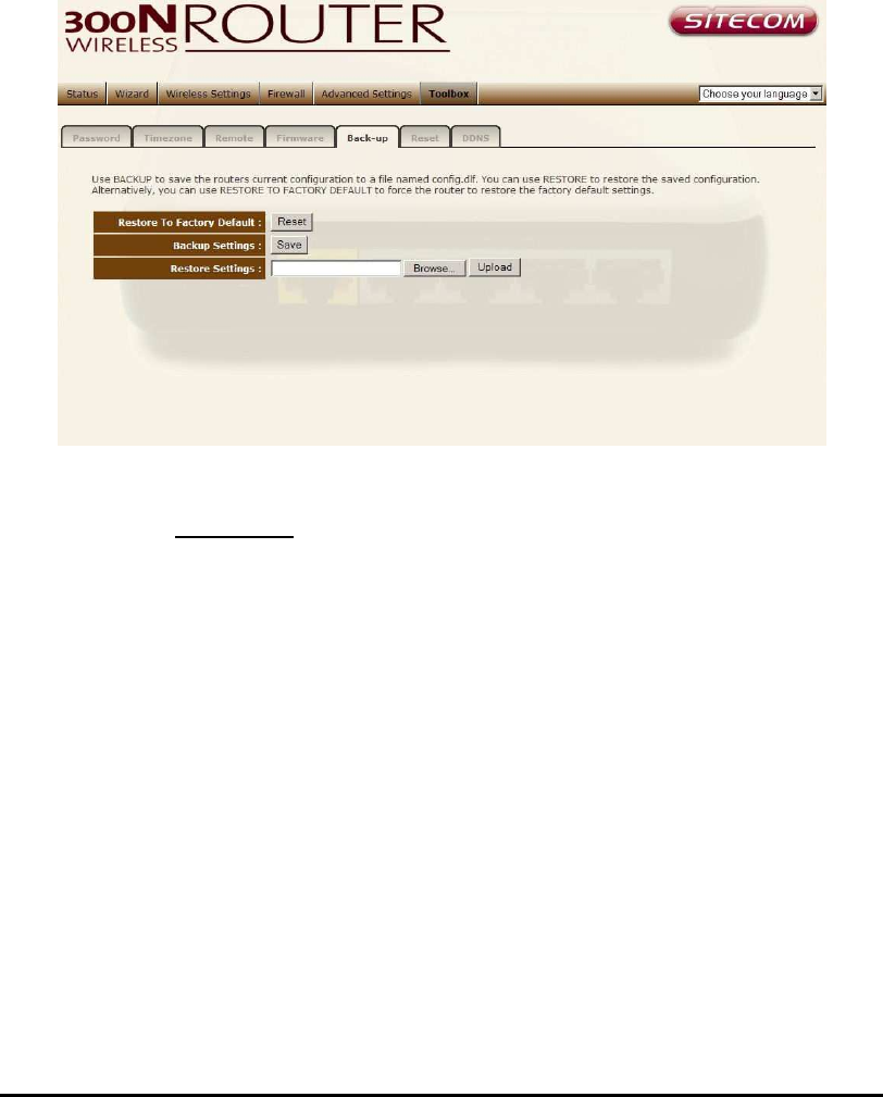 Use the "Backup" tool to save the Broadband router current configuration to a